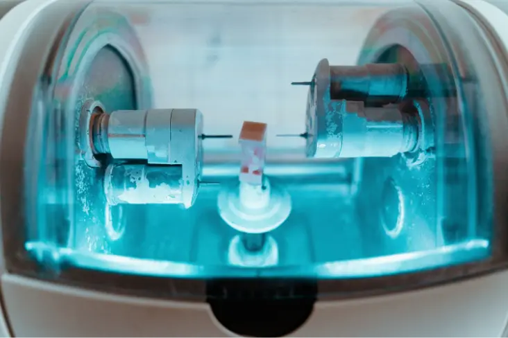 専用の3D光学カメラで歯をスキャンし、そのデータをもとにコンピュータで修復物を設計します。設計されたデータは院内のミリングマシン(削り出し装置)に送られ、短時間で精密なセラミック修復物が完成します。